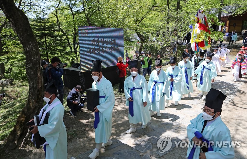 | ▲ 3년 만에 대면 행사로 열린 대관령국사성황제 (강릉=연합뉴스) 유형재 기자 = 2022 강릉단오제의 서막을 알리는 대관령국사성황제가 15일 대관령 국사성황사에서 봉행되고 있다. 대관령국사성황제는 강릉단오제의 주신인 범일국사 국사성황신을 인간 세상으로 모셔 여성황신과 합방을 하는 의식으로 강릉단오제의 서막을 여는 행사다. 2022.5.15 yoo21@yna.co.kr |
