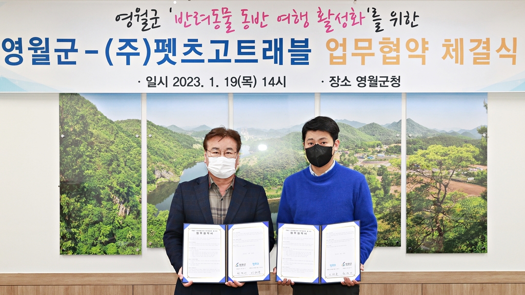 (영월=연합뉴스) 배연호 기자 = 강원 영월군이 19일 반려동물 동반 전문 여행사 펫츠고트래블과 반려동물 동반 여행 활성화를 위한 업무협약을 했다.