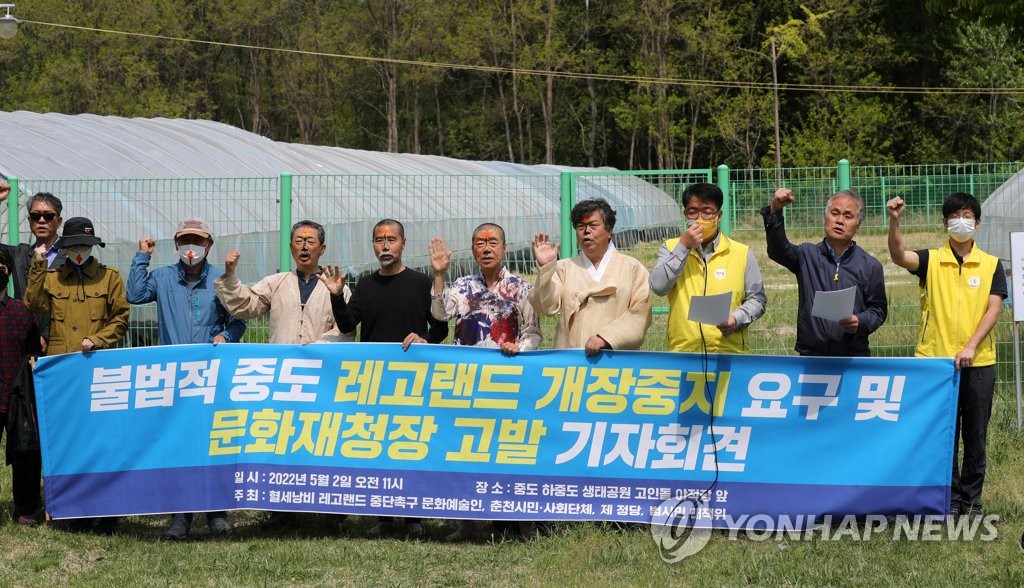 | ▲ 레고랜드 개장 중지 요구·문화재청 고발 기자회견 (춘천=연합뉴스) 박영서 기자 = 2일 오전 강원 춘천시 하중도 생태공원 고인돌(지석묘) 야적장 앞에서 '혈세 낭비 레고랜드 중단 촉구 문화예술인, 춘천시민·사회단체, 제 정당, 범시민대책위' 소속 회원들이 레고랜드 개장 중지 요구 및 문화재청장 고발 기자회견을 하고 있다. 2022.5.2 conanys@yna.co.kr |