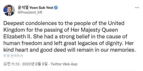 | ▲ This image, a screenshot from President Yoon Suk-yeol's official Twitter account on Sept. 9, 2022, shows his message offering condolences over the death of Britain's Queen Elizabeth II. (PHOTO NOT FOR SALE) |