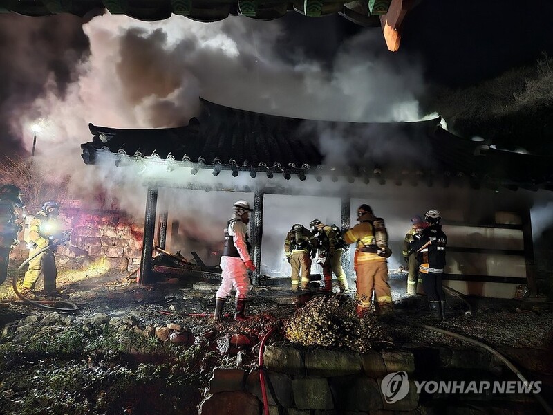 | ▲ Firefighters extinguish a fire at a dormitory for Buddhist monks inside Chiljang Temple in Anseong, 64 kilometers south of Seoul, on Nov. 29, 2023, in this photo provided by the vernacular daily Gyeonggi Ilbo. The blaze, which erupted at 6:50 p.m. the same day, killed Ven. Jaseung, a former head of the Jogye Order, South Korea's largest Buddhist sect, according to a senior official at Bongeun Temple in southern Seoul. (PHOTO NOT FOR SALE) (Yonhap) |