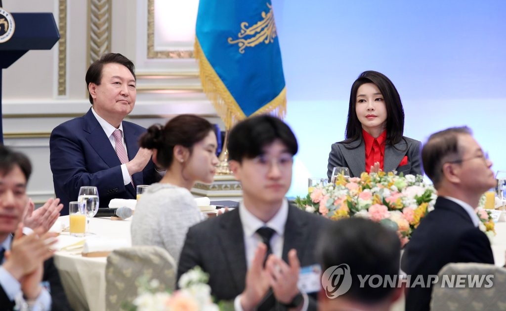 Yoon and first lady Kim Keon Hee hosted some 110 people from 15 lines of work for a luncheon at the former presidential compound of Cheong Wa Dae and thanked them for their hard work.