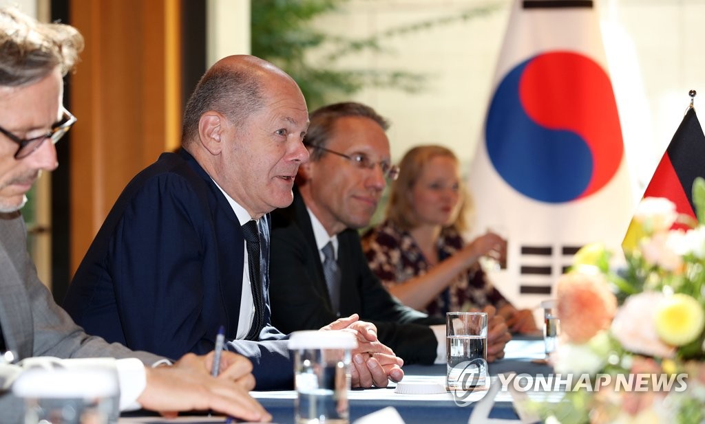 BERLIN, May 19 (Yonhap) -- German Chancellor Olaf Scholz said Friday his government clearly welcomed an approach by South Korea and Japan to rapidly thaw long-strained bilateral ties, emphasizing the need for close cooperation with Seoul and Tokyo over geopolitical tensions in the Indo-Pacific region.