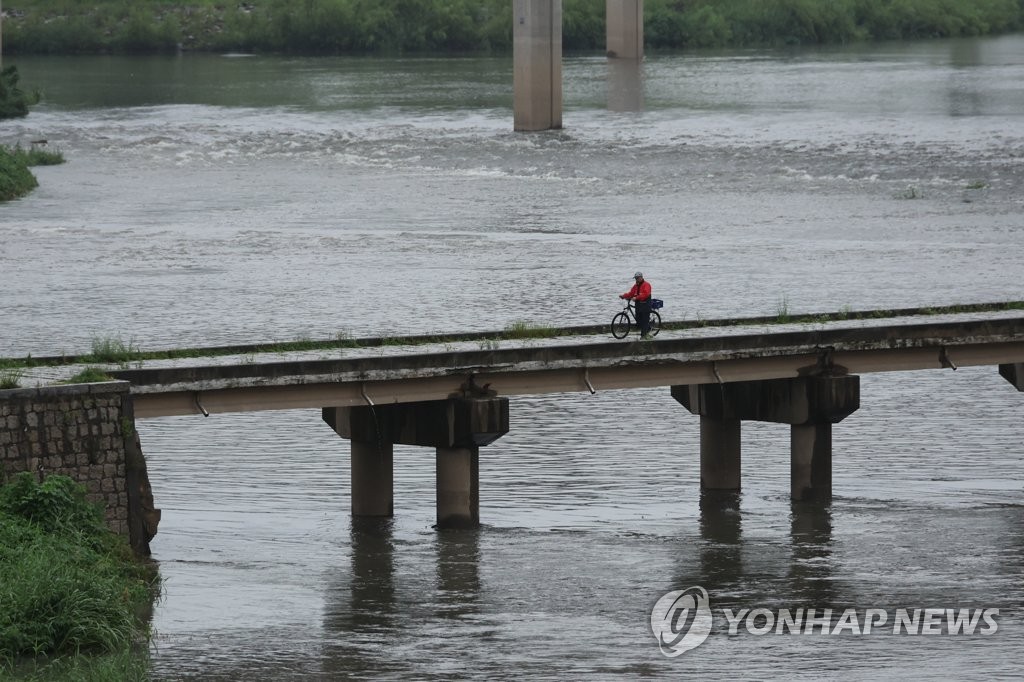 | ▲ A man rides a bicycle across a bridge over the rising Jungnang Stream in Seoul on July 11, 2023, amid torrential rains. (Yonhap) |