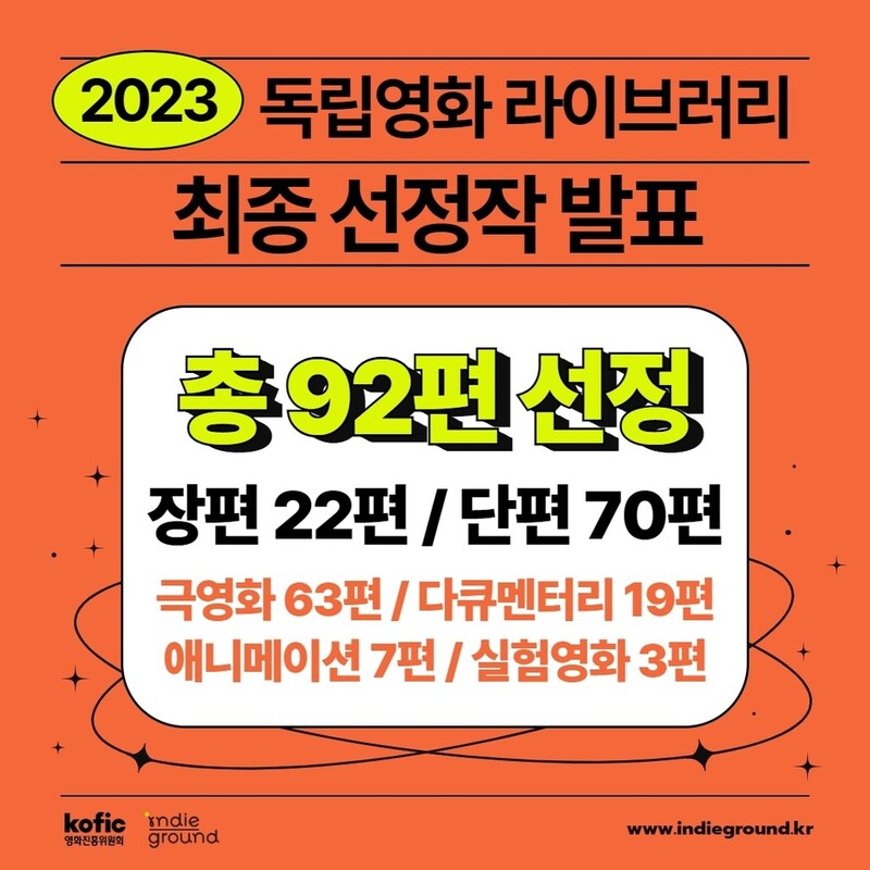 (서울=연합뉴스) 오보람 기자 = 영화진흥위원회(영진위)가 설립한 독립·예술영화 유통배급지원센터 인디그라운드는 올해 '독립영화 라이브러리'에 장편 22편, 단편 70편 등 총 92편을 최종 선정했다고 2일 밝혔다.