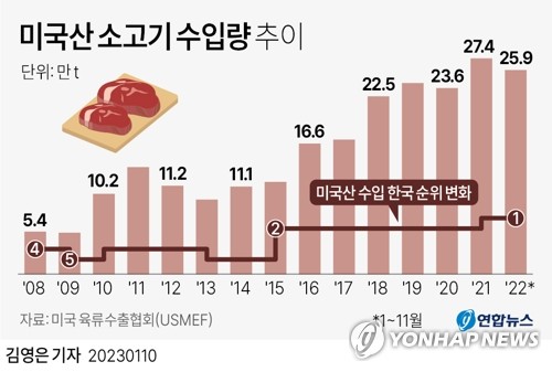 (워싱턴=연합뉴스) 김병수 특파원 = 작년에 한국의 미국산 소고기 수입이 늘어나면서 한국이 지난 2021년에 이어 2년 연속 미국산 소고기의 최대 수출시장 자리에 오를 것으로 예상된다.