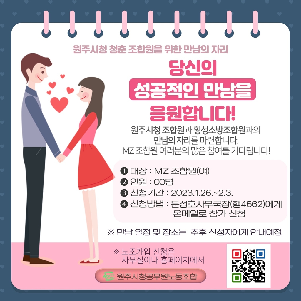 (원주=연합뉴스) 이재현 기자 = 원주시청 공무원노동조합(이하 원공노)이 청춘남녀의 만남 자리를 마련한다.