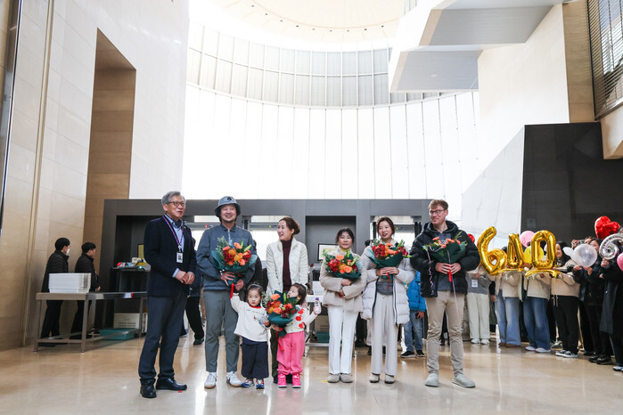 Yoo Hong-joon (L), director of the National Museum of Korea, poses with the family of the 6 millionth visitor at the entrance of the museum in Yongsan, central Seoul, on Dec. 11, 2025. (Yonhap)