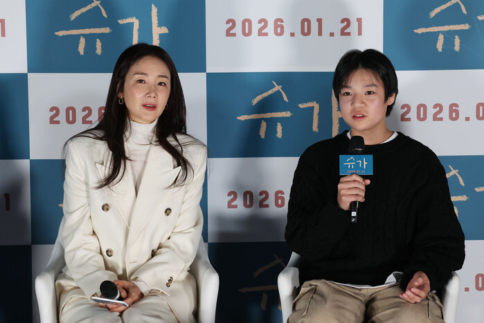 South Korean actor Ko Dong-ha and actress Choi Ji-woo, who star in the new movie "Sugar," attend a publicity event in Seoul on Dec. 18, 2025, to promote the movie, set to hit local screens in South Korea on Jan. 21. (Yonhap)