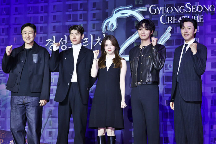 The stars of the "Gyeongseong Creature, Season 2" an original series by Netflix, -- Bae Hyun-sung, Han So-hee, Park Seo-jun and Lee Moo-saeng (2nd L to R) -- along with director Jung Dong-yoon (L) -- pose for a photo during a publicity event in Seoul on Sept. 25, 2024. The 7-episode series will be released worldwide on Sept. 27. (Yonhap)