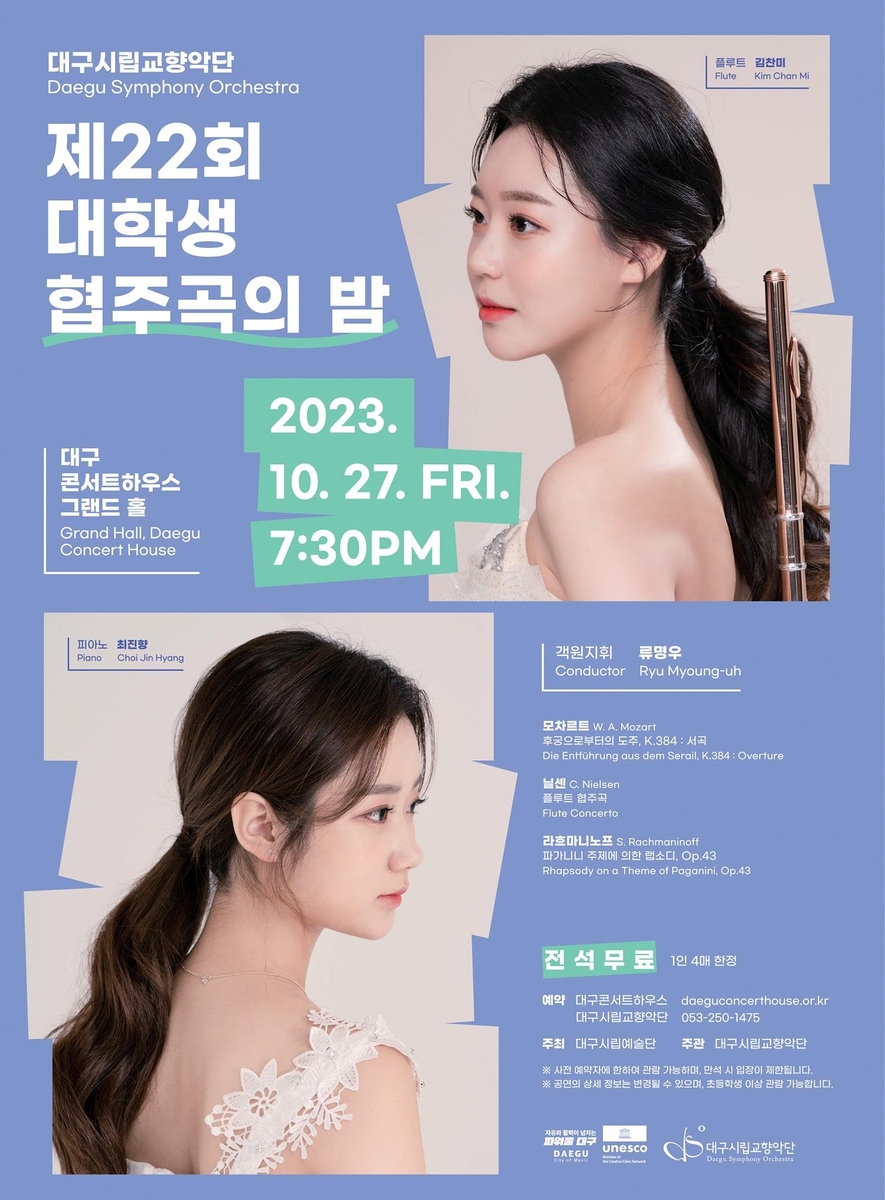 공연에는 대구시향 협연자 오디션에 최종 합격한 플루티스트 김찬미(영남대 4학년)와 피아니스트 최진향(계명대 3학년)이 함께한다.