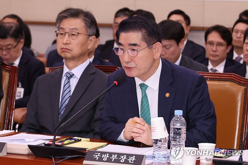 | ▲ Defense Minister Kim Yong-hyun (R) attends a parliamentary committee meeting at the National Assembly in Seoul on Nov. 4, 2024. (Yonhap) |