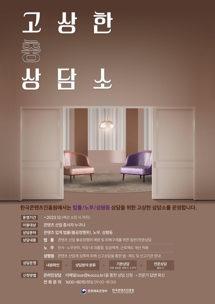 ▲ 콘텐츠산업 종사자 통합 상담창구 신설 = 문체부와 한국콘텐츠진흥원은 콘텐츠 산업 종사자의 권리를 보호하고 건강한 산업 생태계를 조성하고자 종합 상담창구인 '고상한 상담소'를 신설했다.