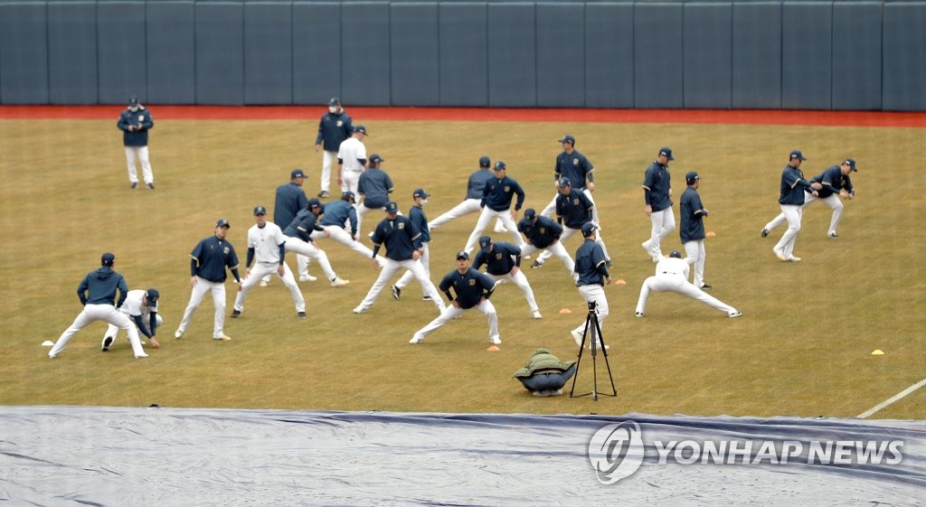 | ▲ Members of the NC Dinos stretch at Masan Baseball Stadium in Changwon, 400 kilometers southeast of Seoul, at the start of spring training on Feb. 1, 2021. (Yonhap) |