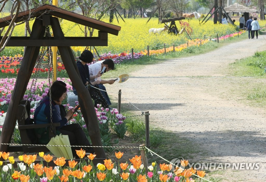 | ▲ 봄과 여름 사이 (창녕=연합뉴스) 이정훈 기자 = 낮 기온이 초여름을 방불케 하는 27도까지 오른 12일 낮, 경남 창녕군 남지읍 낙동강 변 유채단지에서 양산과 부채를 든 시민들이 그늘이 있는 의자에 앉아 휴대폰으로 사진을 찍거나 휴식을 취하고 있다. 2022.4.12 seaman@yna.co.kr |
