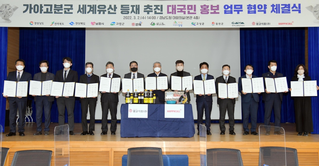 협약식에는 경남도, 전북도, 경북도, 남원시, 고령군, 김해시, 함안군, 고성군, 창녕군, 합천군 등 가야고분군 세계유산 등재 추진 관련 10개 지자체와 가야고분군 세계유산등재추진단, 향토기업인 몽고식품과 해피콜이 참여했다.
