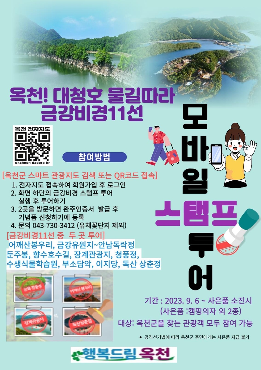 군 관계자는 "금강 비경 11선을 알리기 위해 스마트관광지도에 음성안내시스템을 구축해 보다 재미있는 투어가 되도록 했다"며 "공직선거법 때문에 옥천군민은 기념품 지급대상에서 제외되는 점을 양해해달라"고 말했다.
