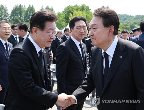 | ▲ President Yoon Suk Yeol (R) shakes hands with opposition leader Lee Jae-myung at a Memorial Day event at Seoul National Cemetery in Seoul in this file photo taken June 6, 2023. (Yonhap) |