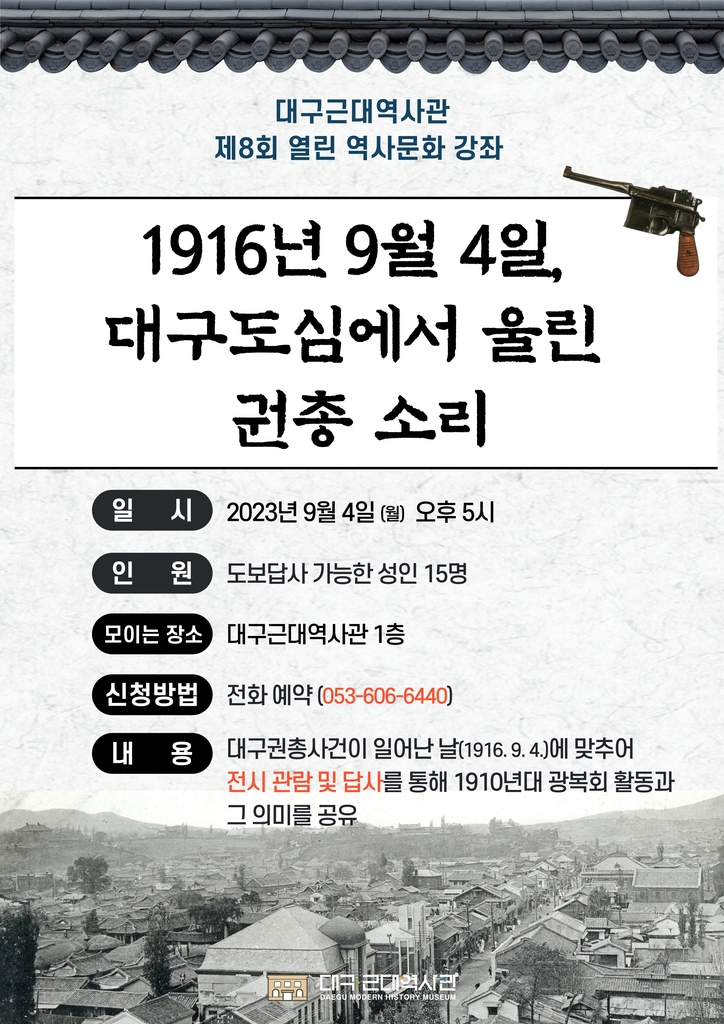 ▲ 대구근대역사관은 다음 달 4일 오후 5시 1910년대 광복회 활동을 주제로 한 역사문화 강좌를 개최한다고 28일 밝혔다. 지역 내 광복회 활동 흔적들을 살펴보는 답사를 겸한 행사다. 자세한 내용은 대구근대역사관(☎053-606-6440)으로 문의하면 된다. (대구=연합뉴스)