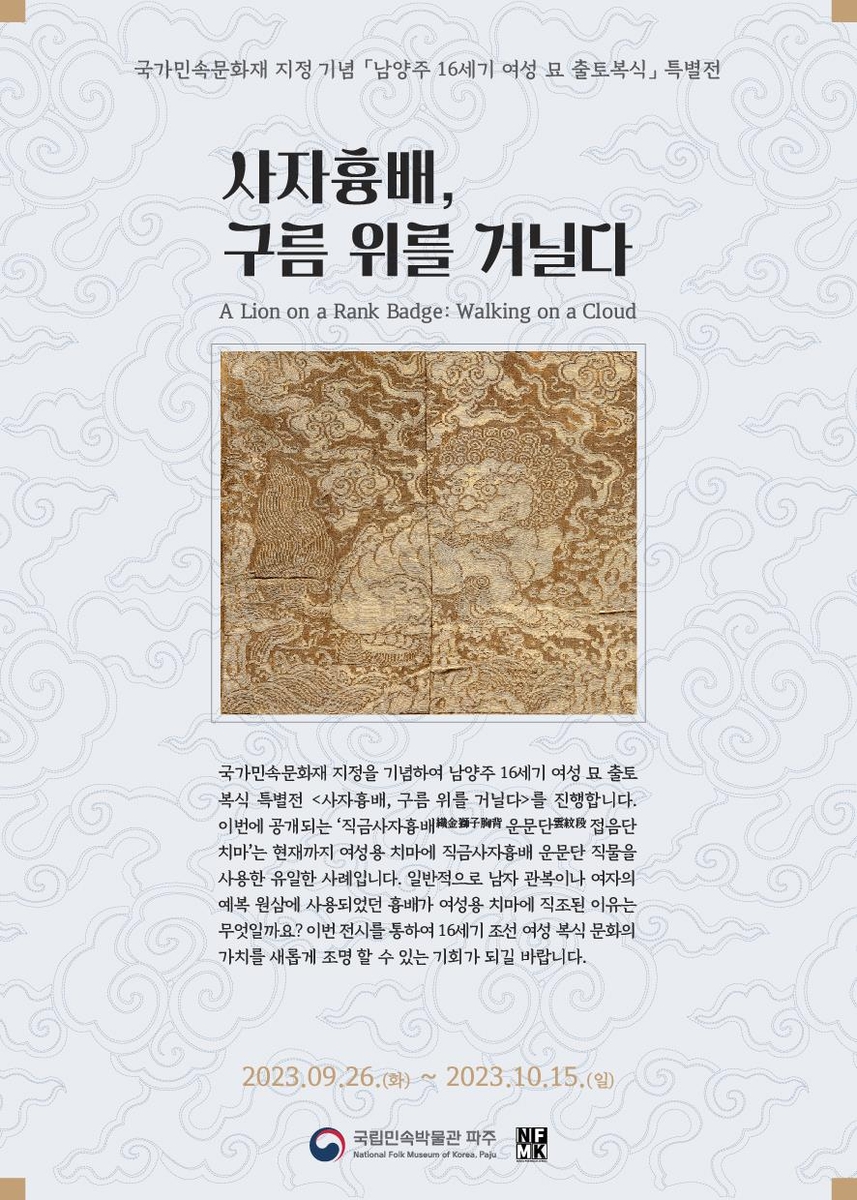 국립민속박물관은 국가민속문화재 지정을 기념해 이날부터 10월 15일까지 약 3주간 파주관에서 '사자흉배, 구름 위를 거닐다' 특별전을 열고 유물을 처음으로 일반에 공개한다.