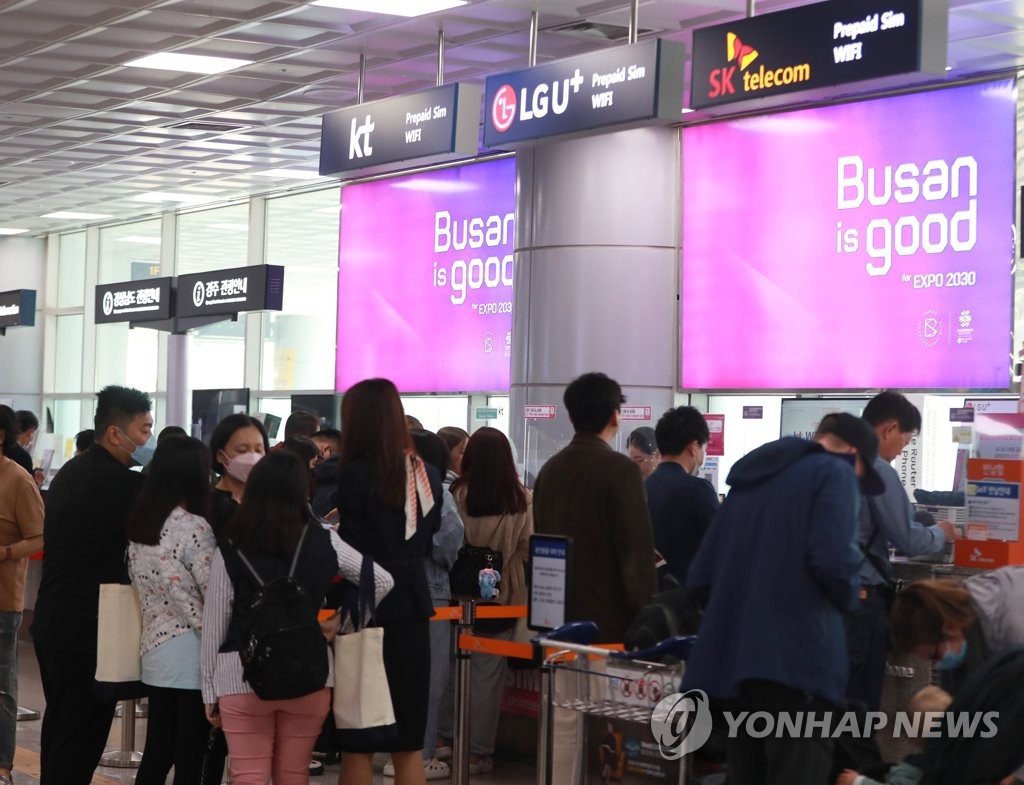 | ▲ 로밍 신청에 긴 대기줄 (부산=연합뉴스) 박성제 기자 = 28일 오전 부산 김해국제공항 입국장이 일본의 황금연휴인 골든위크를 맞아 부산을 찾은 일본 관광객들이 휴대폰 로밍을 신청하고 있다. 관광업계에 따르면 중국·일본의 연휴로 다음 달 초까지 부산을 방문하는 외국인 입국객이 대거 늘어날 것으로 예상된다. 2023.4.28 psj19@yna.co.kr |