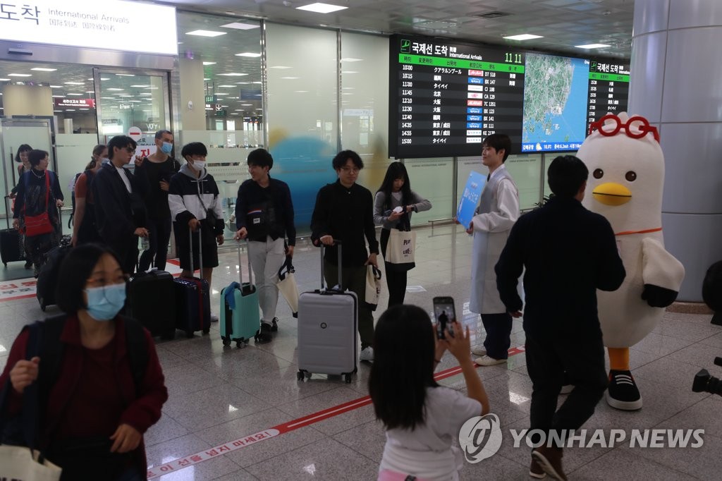 이날 오전 일본 후쿠오카에서 에어부산과 제주항공 항공기를 이용해 부산에 도착한 일본인 여행객들은 저마다 여행 가방을 들고 설레는 표정으로 입국장에 들어섰다.