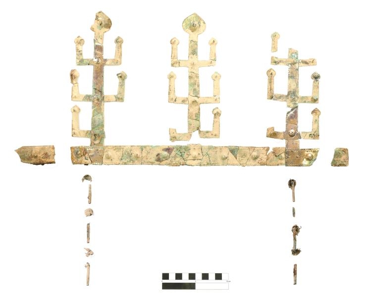 연구소 관계자는 "관테 아래에는 길게 늘어뜨린 장식이 있는데, 여기에 부착된 반구형 장식과 원통형 장식은 직물로 추정되는 것을 꼬아서 연결했다는 점을 처음으로 확인했다"고 설명했다.