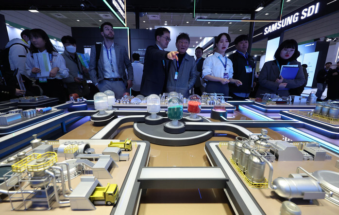 This image shows Korea Zinc's model showing the whole process to make batteries at the Interbattery 2024 at COEX in Seoul on March 6, 2024. (Yonhap)