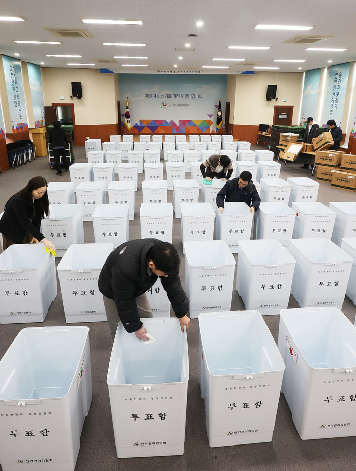 Officials check ballot boxes at the regional election management commission in Suwon, 30 kilometers south of Seoul, on March 11, 2024, 30 days ahead of the general elections. (Yonhap)
