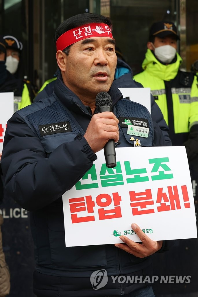 | ▲ Chang Ok-ki, the head of the construction union affiliated with the Korean Confederation of Trade Union, speaks during a press conference in front of a union office in Seoul on Jan. 19, 2023. (Yonhap) |