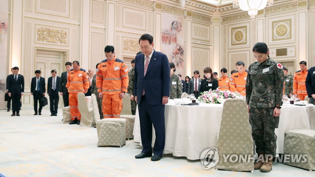 | ▲ President Yoon Suk Yeol (2nd from R) and a South Korean rescue team that was dispatched to Turkey following a devastating earthquake pay silent tribute to the quake's victims during a luncheon meeting for the contingent at the guesthouse of the former presidential office, Cheong Wa Dae, in Seoul on March 7, 2023. (Pool photo) (Yonhap) |