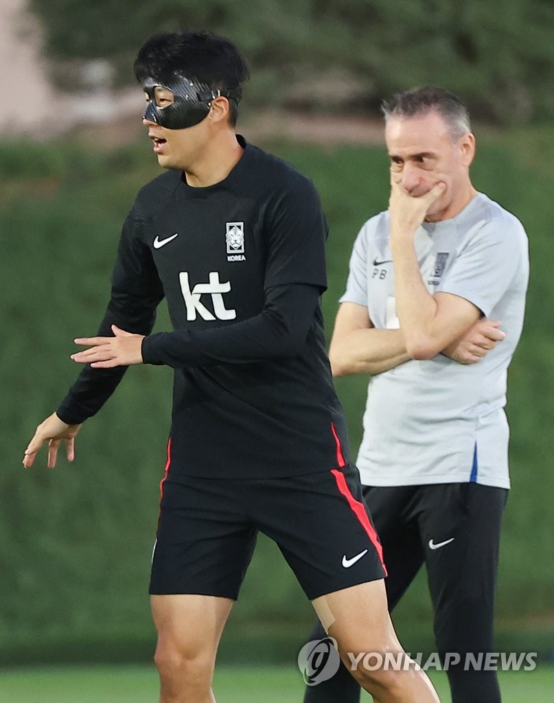 | ▲ 벤투 감독의 고심 (도하=연합뉴스) 김도훈 기자 = 2022 카타르 월드컵 대표팀 파울루 벤투 감독이 22일(현지시간) 카타르 도하 알에글라 훈련장에서 훈련하는 손흥민을 바라보고 있다. 2022.11.22 superdoo82@yna.co.kr |