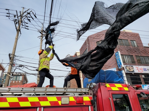 ▲ Firefighters remove a tent, blown down by strong winds, from power lines on the southern Jeju Island on April 18, 2023, in this photo provided by the local fire service. (PHOTO NOT FOR SALE) (Yonhap)