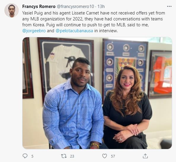 | ▲ 야시엘 푸이그(왼쪽)와 에이전트 리세테 카르넥 [프랜시스 로메로 기자 트위터 캡처. 재판매 및 DB 금지] |