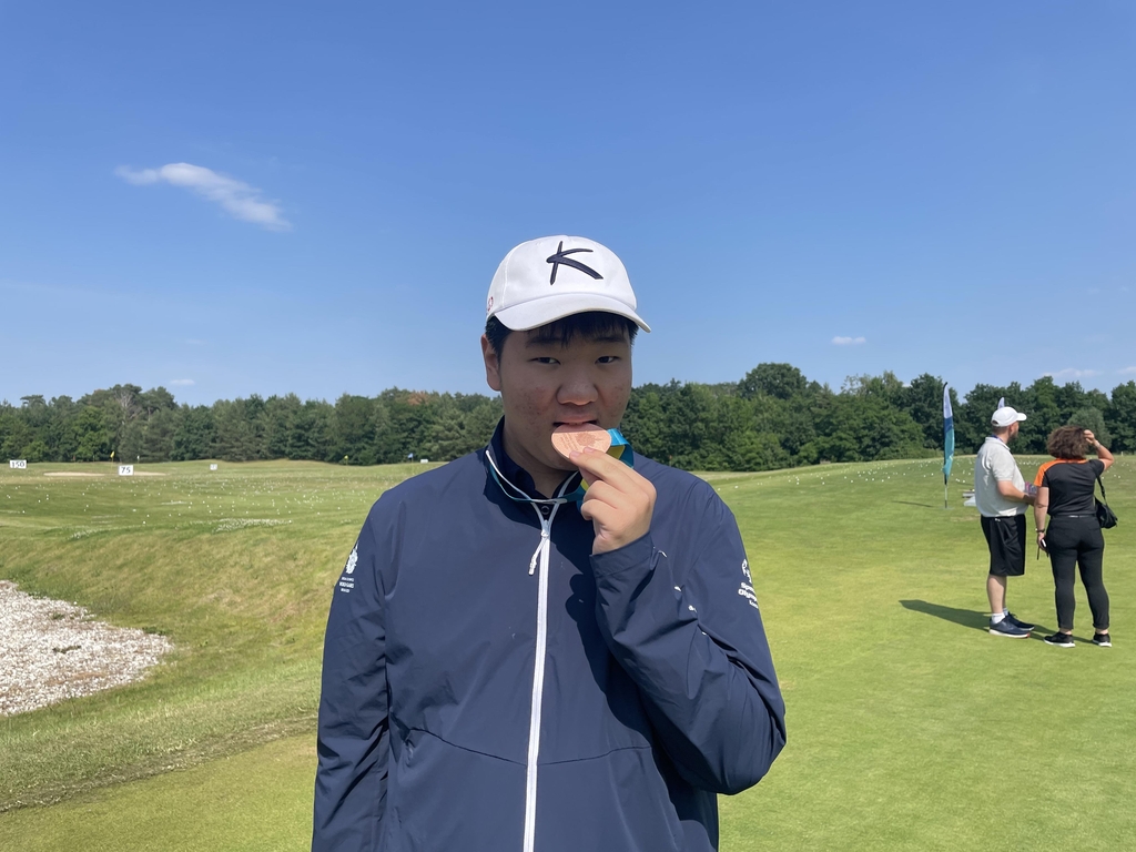 | ▲ 스페셜올림픽 골프 개인기술경기서 동메달 딴 손원희 선수 (베를린=연합뉴스) 이율 특파원 = 2023 베를린 스페셜 올림픽 골프 개인기술경기 종목에 출전한 손원희 선수가 동메달을 딴 뒤 포즈를 취하고 있다. 2023.6.22 |