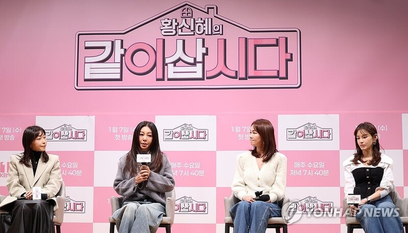 | ▲ '황신혜의 같이 삽시다' (서울=연합뉴스) 강민지 기자 = 6일 서울 영등포구 KBS아트홀에서 예능 '황신혜의 같이 삽시다' 제작발표회가 열리고 있다. 왼쪽부터 이선희 CP, 황신혜, 장윤정, 정가은. 2026.1.6 mjkang@yna.co.kr |