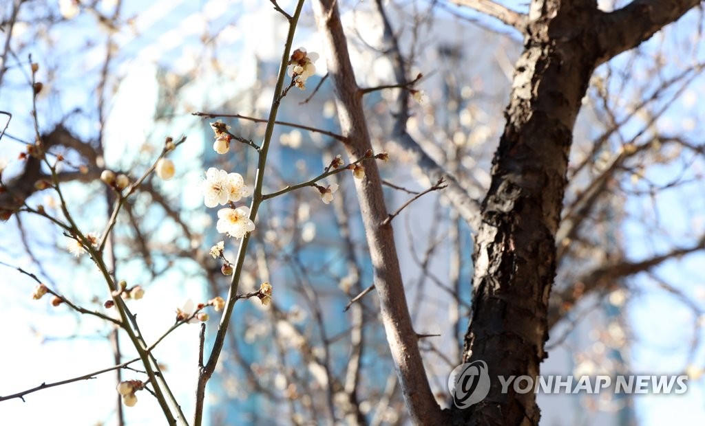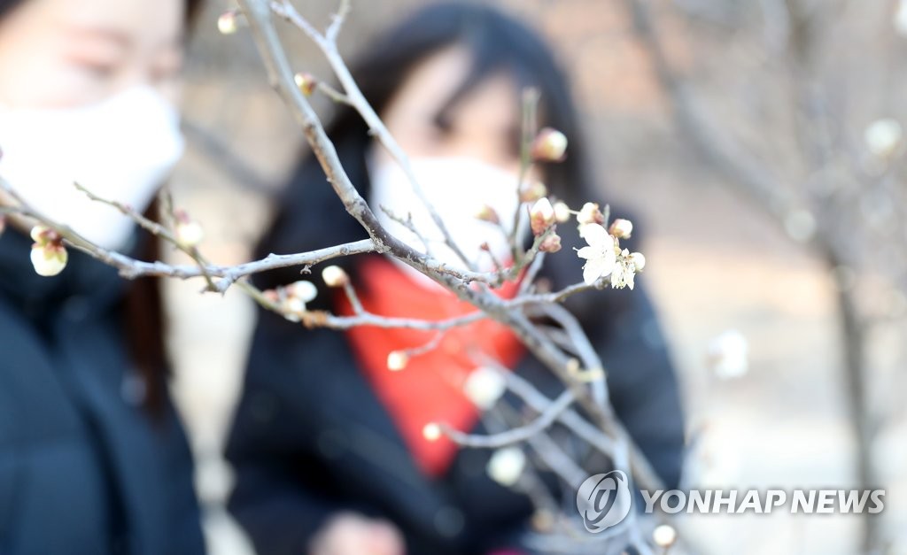 | ▲ 아직 한겨울인데 (포항=연합뉴스) 손대성 기자 = 12일 경북 포항시 남구 대잠동 포항시청 인근에 매화가 피어 시민들이 구경하고 있다. 2022.1.12 sds123@yna.co.kr |