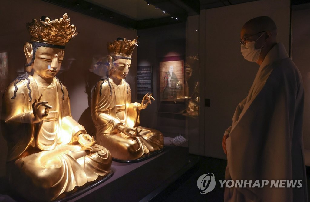 ▲ 환지본처 특별전, 돌아온 불상 (서울=연합뉴스) 류효림 기자 = 29일 오전 서울 종로구 견지동 조계사 불교중앙박물관에서 개막한 '환지본처, 돌아온 성보문화재 특별 공개전'에서 관람객이 환수된 불상을 관람하고 있다. 2022.4.29 ryousanta@yna.co.kr