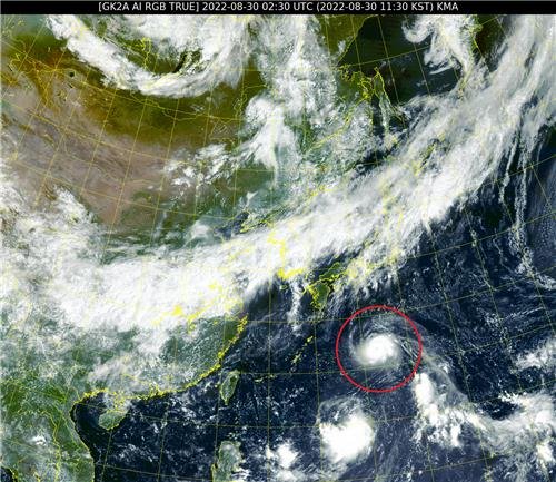 | ▲ 올해 첫 '매우 강' 태풍 힌남노 (서울=연합뉴스) 30일 오전 11시 30분 천리안위성 2A호에 포착된 제11호 태풍 힌남노(붉은색 원). 기상청에 따르면 힌남노는 이날 오전 9시 현재 일본 오키나와 동쪽 930㎞ 해상에서 시속 32㎞ 속도로 대만 쪽으로 서진 중이다. 힌남노 중심기압과 최대풍속은 각각 945hPa(헥토파스칼)과 45㎧로 '매우 강' 태풍으로 분류된다. 2022.8.30 [국가기상위성센터 제공. 재판매 및 DB 금지] photo@yna.co.kr |