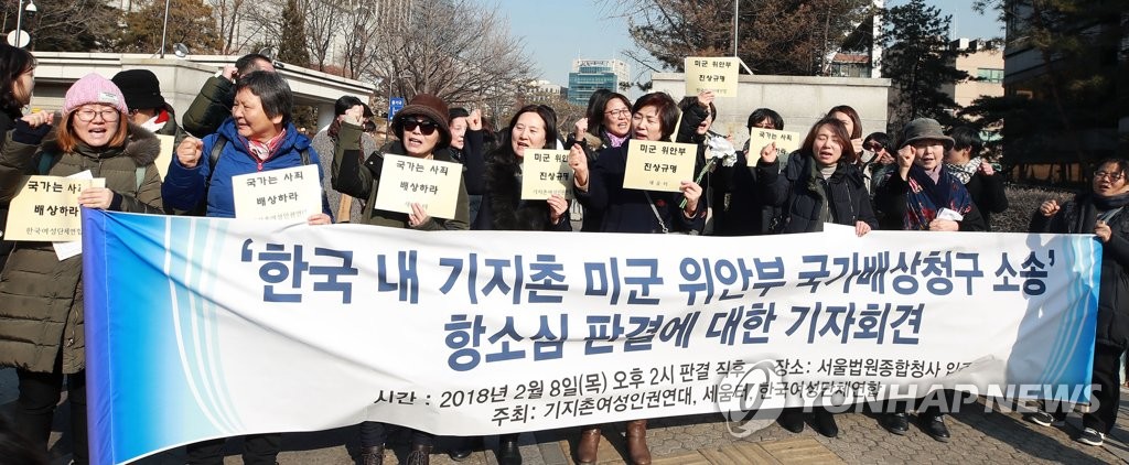 | ▲ In this file photo, activists supporting ex-sex workers who served U.S. troops hold a press conference in front of a court in Seoul on Feb. 8, 2018. (Yonhap) |
