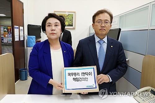 SEOUL, Sept. 18 (Yonhap) -- The main opposition Democratic Party (DP) filed a motion calling for the dismissal of Prime Minister Han Duk-soo on Monday, urging President Yoon Suk Yeol to carry out a complete overhaul of the way he runs the government.