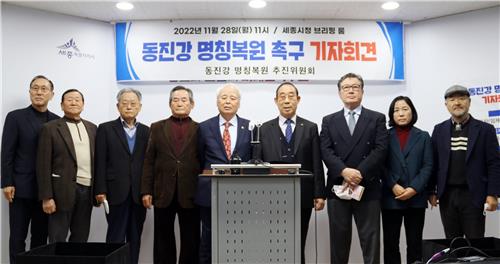 | ▲ "미호강 명칭 동진강으로 변경해야" (세종=연합뉴스) 이은파 기자 = 임창철 세종문화원장을 비롯한 동진강 명칭 복원 추진위원회 위원들이 28일 세종시청 브리핑룸에서 기자회견을 열고 미호강 명칭을 동진강으로 변경해야 할 당위성을 설명하고 있다. 2022.11.28 |