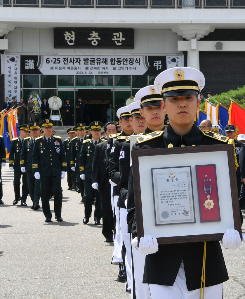 SEOUL, June 22 (Yonhap) -- The South Korean military held ceremonies Thursday to lay to rest the remains of six service members killed in the 1950-53 Korean War following their excavation from former battle sites, the Army said.