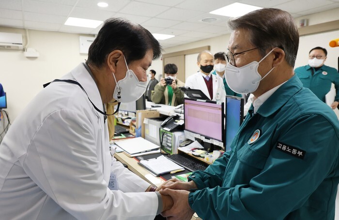 Labor Minister Lee Jeong-sik (R) encourages medical workers during a visit to a hospital in Daejeon on March 6, 2024, amidst an ongoing walkout by thousands of trainee doctors across the country. (Yonhap)