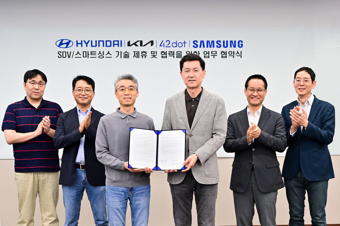 Officials from Samsung Electronics Co. and Hyundai-Kia Automotive Group pose after signing an agreement on technical tie-up and cooperation in Seoul, on Sept. 25, 2024, in this photo provided by Samsung. (PHOTO NOT FOR SALE) (Yonhap)