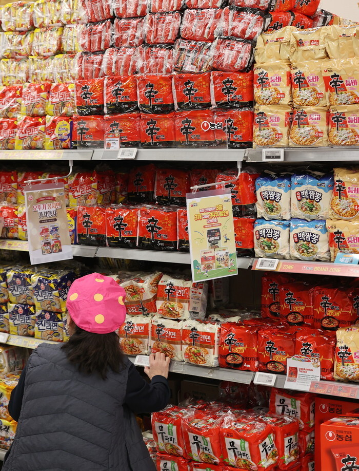 An employee displays instant noodles, or "ramyeon" in Korean, at a supermarket in Seoul on Jan. 8, 2025. South Korea's exports of agricultural goods and related products, including ramyeon, grew 6.1 percent from a year before to a record high in 2024 amid growing overseas demand for instant noodles and processed rice items, the agriculture ministry said. (Yonhap)