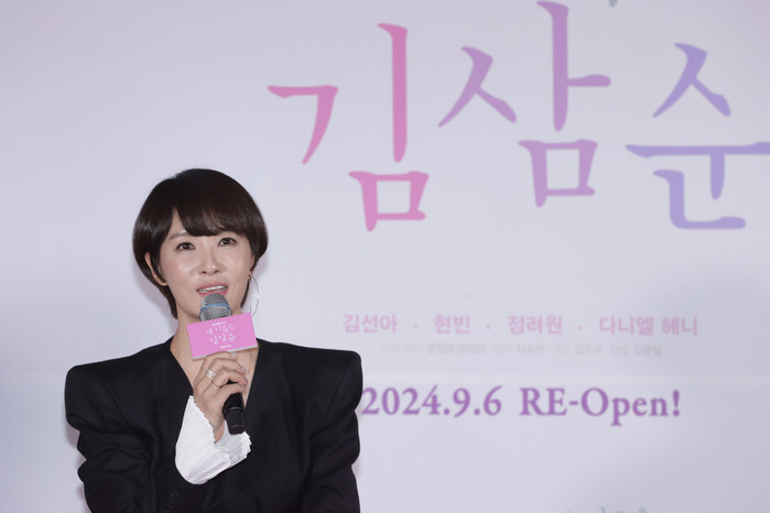 South Korean actress Kim Sun-ah, who starred in the drama "My Name is Kim Sam-soon 2024," greets during a publicity event in Seoul on Sept. 5, 2024. The directorial version, which will be released on Wave on the 6th, will be released in eight episodes by editing "Kim Sam-soon," which was broadcast in 2005 and upscaling the quality and sound quality. (Yonhap)