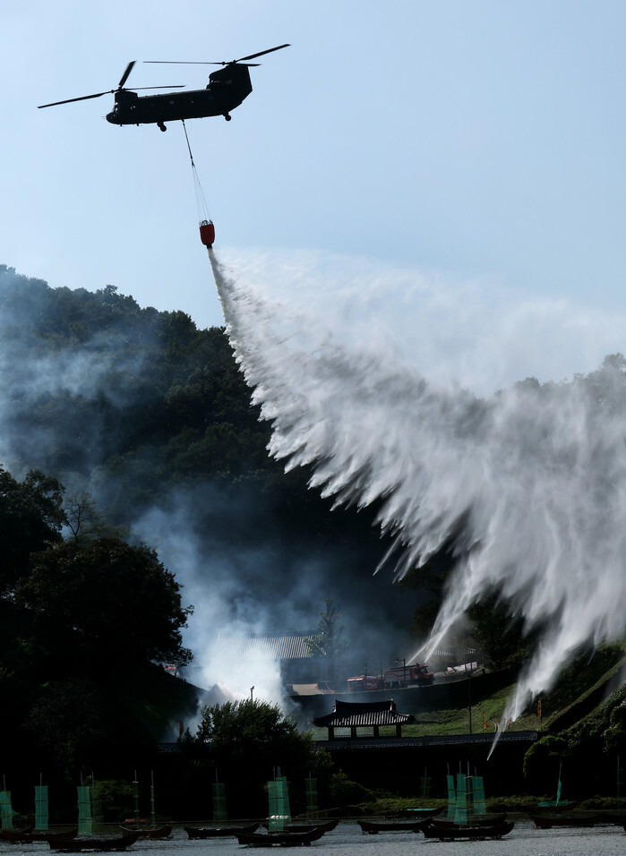Disaster drill against wildfires A helicopter dumps water during a wildfire drill at Gongsan Castle in Gongju, South Chungcheong Province, central South Korea, on Oct. 22, 2025. (Yonhap) (END)