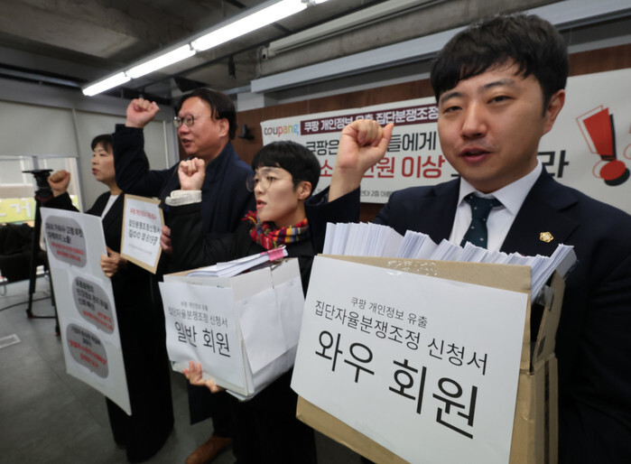 Civic activists hold a news conference in Seoul on Dec. 10, 2025, to call on e-commerce giant Coupang to compensate victims of its massive data breach. (Yonhap)