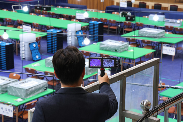 An official examines a ballot counting station set up at a middle school in Busan on April 9, 2024, to determine if any hidden cameras have been installed, one day prior to the general elections to choose 300 lawmakers. (Yonhap)